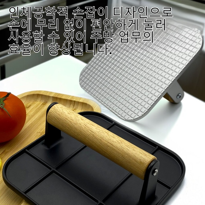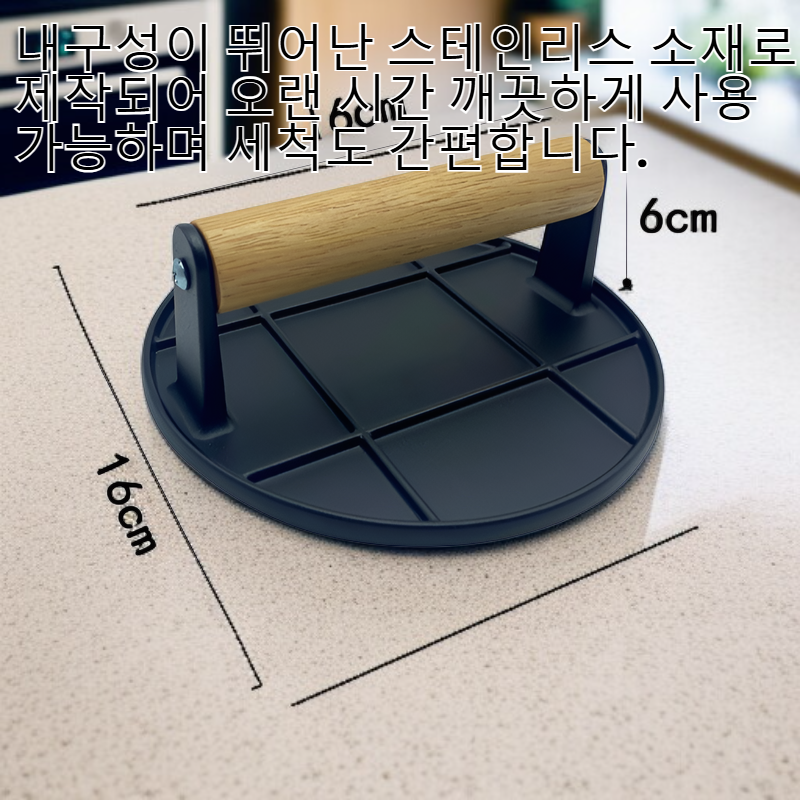● 햄버거 고기 누름판으로 고기 패티를 균일한 두께와 크기로 손쉽게 만들 수 있어 요리의 완성도가 높아집니다. ● 내구성이 뛰어난 스테인리스 소재로 제작되어 오랜 시간 깨끗하게 사용 가능하며 세척도 간편합니다. ● 인체공학적 손잡이 디자인으로 손에 무리 없이 편안하게 눌러 사용할 수 있어 주방 업무의 효율이 향상됩니다. ● 다양한 고기뿐 아니라 감자전, 채소전 등 여러 요리에 활용할 수 있어 다용도로 사용 가능합니다. ● 가정용은 물론 업소용으로도 적합해 햄버거 전문점이나 카페에서도 효과적으로 사용할 수 있습니다.